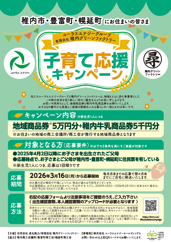 このたび、有限会社稚内グリーンファクトリーは、稚内市・豊富町・幌延町にお住まいのお子さまを出生されたご父母を対象に、子育て応援キャンペーンとして地域商品券と稚内牛乳商品券をお贈りする取り組みを開始します。今回の取り組みはユーラスエナジーグループーと共同にて実施します。